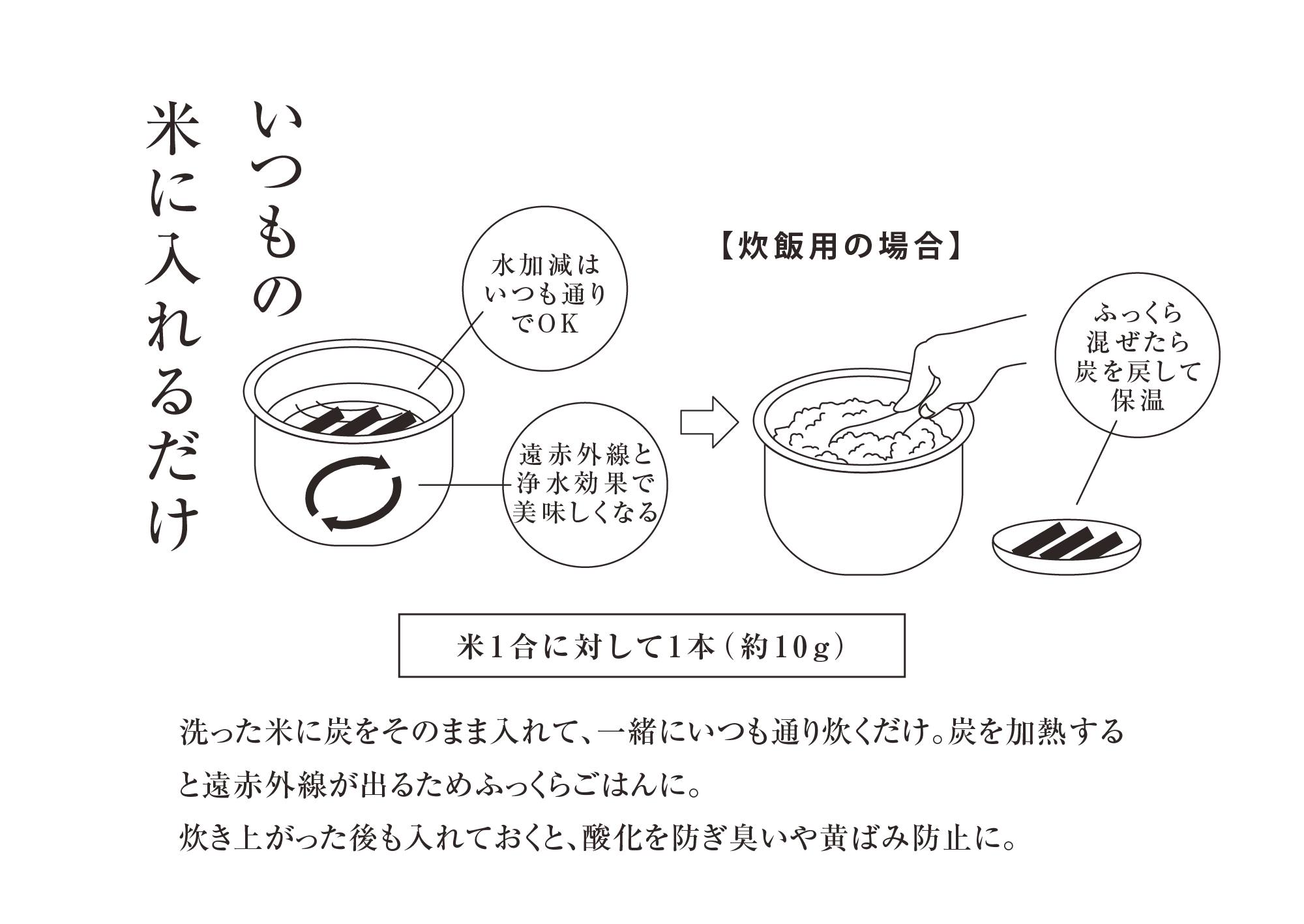 炊飯用備長炭を米1合につき1本(約10 g)入れて炊くだけで、